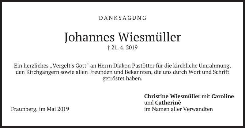 Hier finden Sie alle Traueranzeigen aus der Zeitung, die bisher für Johannes Wiesmüller erschienen sind. Weitere Traueranzeigen, die in der Zeitung erscheinen, werden hier ebenfalls aufgelistet