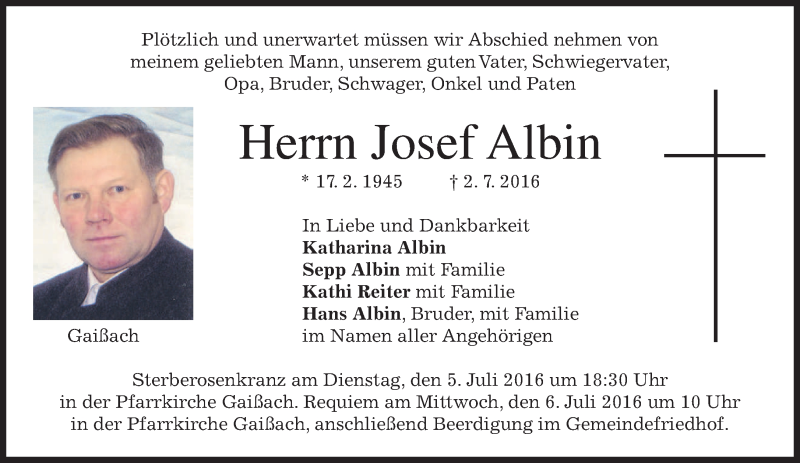 Hier finden Sie alle Traueranzeigen aus der Zeitung, die bisher für Josef Albin erschienen sind. Weitere Traueranzeigen, die in der Zeitung erscheinen, werden hier ebenfalls aufgelistet