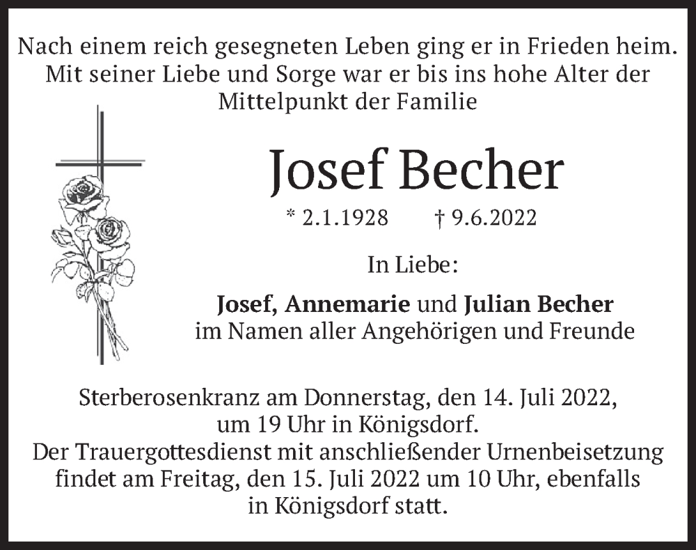 Hier finden Sie alle Traueranzeigen aus der Zeitung, die bisher für Josef Becher erschienen sind. Weitere Traueranzeigen, die in der Zeitung erscheinen, werden hier ebenfalls aufgelistet