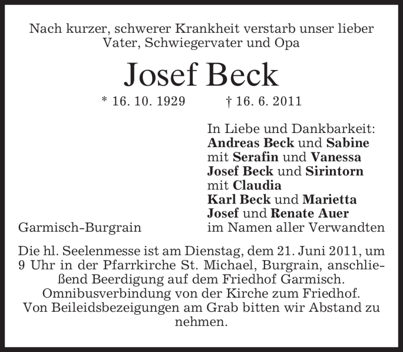 Hier finden Sie alle Traueranzeigen aus der Zeitung, die bisher für Josef Beck erschienen sind. Weitere Traueranzeigen, die in der Zeitung erscheinen, werden hier ebenfalls aufgelistet