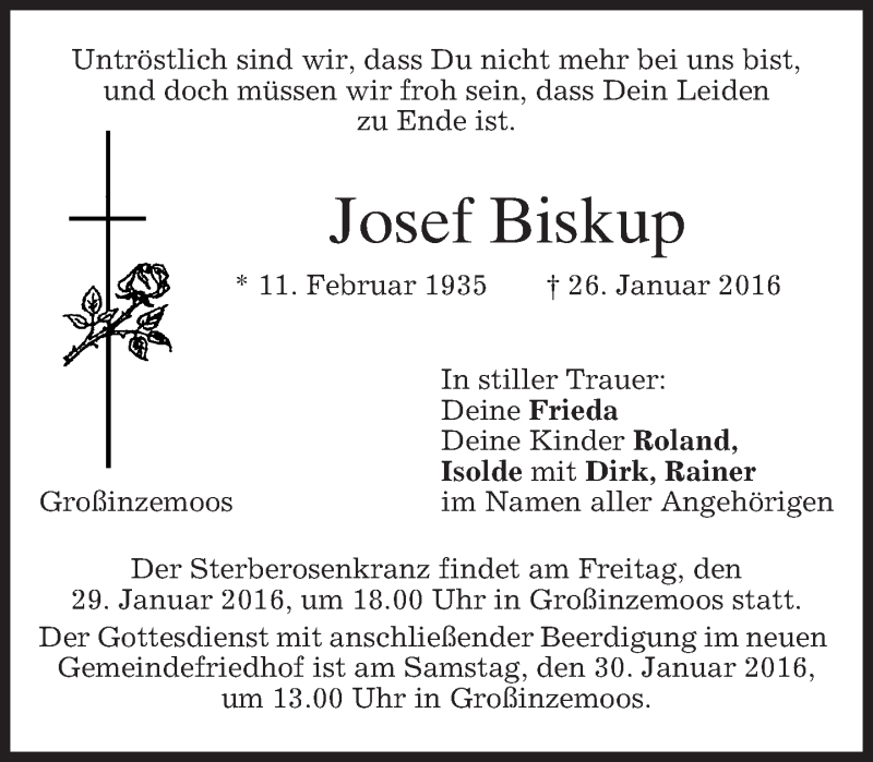 Hier finden Sie alle Traueranzeigen aus der Zeitung, die bisher für Josef Biskup erschienen sind. Weitere Traueranzeigen, die in der Zeitung erscheinen, werden hier ebenfalls aufgelistet