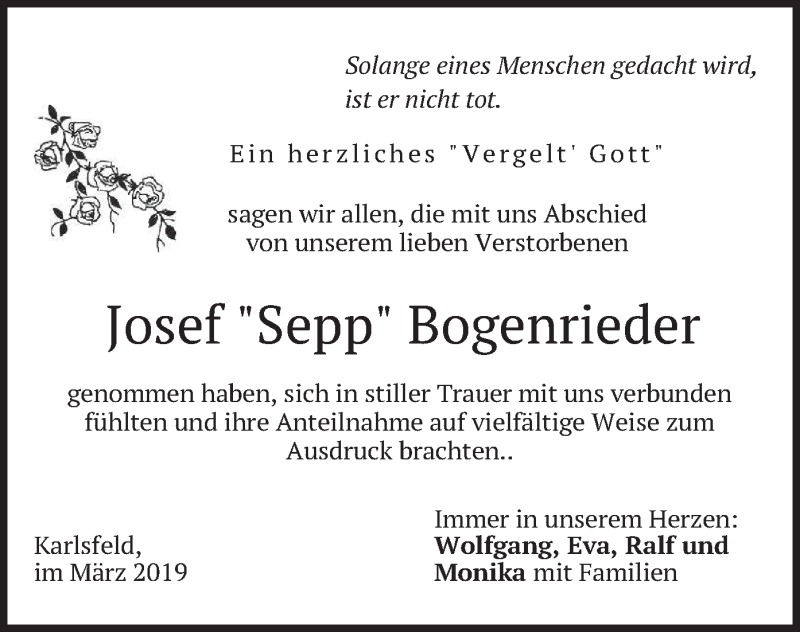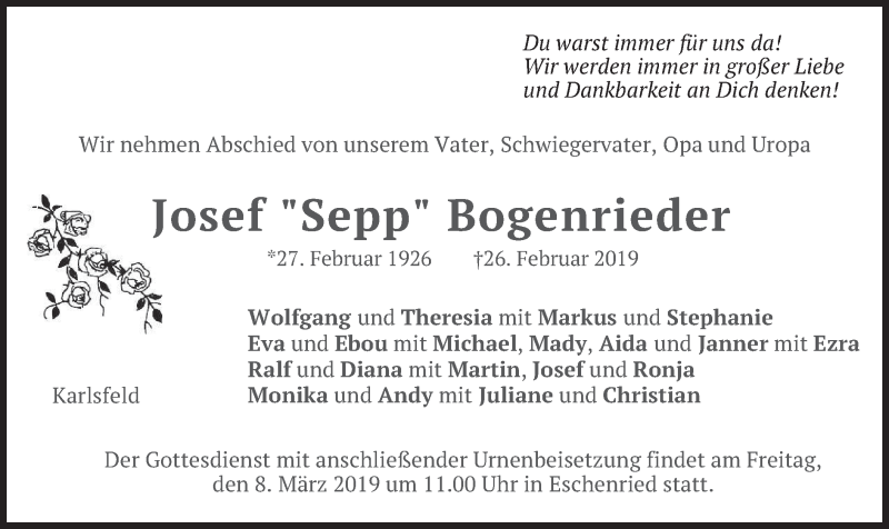 Hier finden Sie alle Traueranzeigen aus der Zeitung, die bisher für Josef Bogenrieder erschienen sind. Weitere Traueranzeigen, die in der Zeitung erscheinen, werden hier ebenfalls aufgelistet