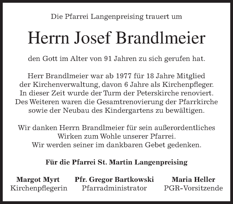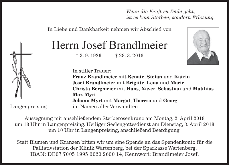 Hier finden Sie alle Traueranzeigen aus der Zeitung, die bisher für Josef Brandlmeier erschienen sind. Weitere Traueranzeigen, die in der Zeitung erscheinen, werden hier ebenfalls aufgelistet
