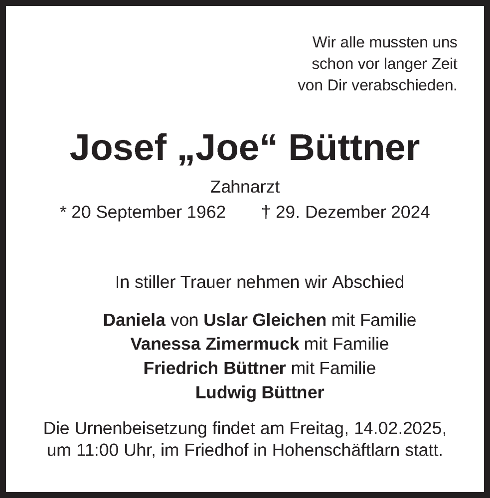 Hier finden Sie alle Traueranzeigen aus der Zeitung, die bisher für Josef Büttner erschienen sind. Weitere Traueranzeigen, die in der Zeitung erscheinen, werden hier ebenfalls aufgelistet