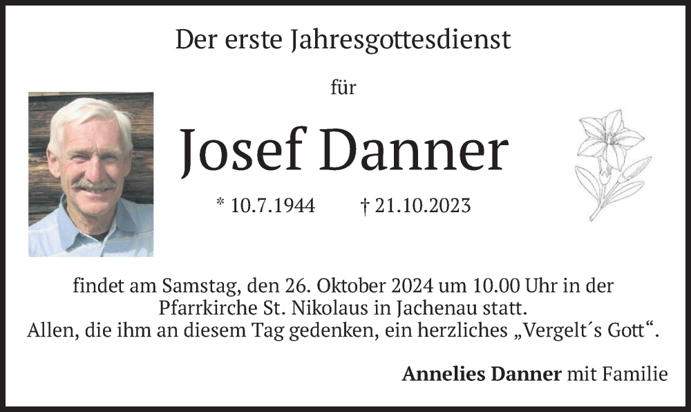 Hier finden Sie alle Traueranzeigen aus der Zeitung, die bisher für Josef Danner erschienen sind. Weitere Traueranzeigen, die in der Zeitung erscheinen, werden hier ebenfalls aufgelistet
