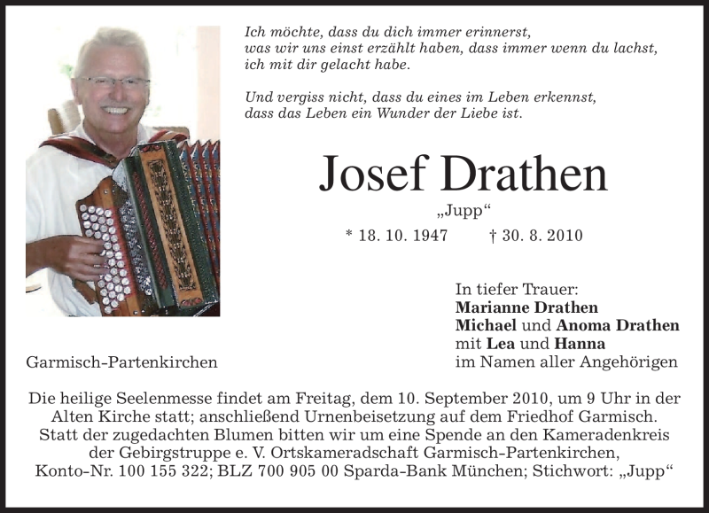 Hier finden Sie alle Traueranzeigen aus der Zeitung, die bisher für Josef Drathen erschienen sind. Weitere Traueranzeigen, die in der Zeitung erscheinen, werden hier ebenfalls aufgelistet
