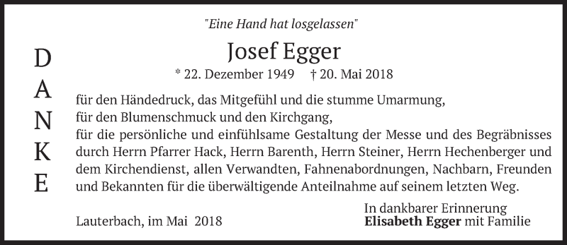 Hier finden Sie alle Traueranzeigen aus der Zeitung, die bisher für Josef Egger erschienen sind. Weitere Traueranzeigen, die in der Zeitung erscheinen, werden hier ebenfalls aufgelistet