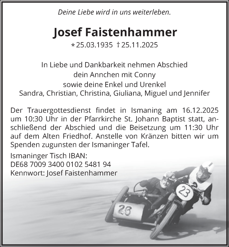 Hier finden Sie alle Traueranzeigen aus der Zeitung, die bisher für Josef Faistenhammer erschienen sind. Weitere Traueranzeigen, die in der Zeitung erscheinen, werden hier ebenfalls aufgelistet