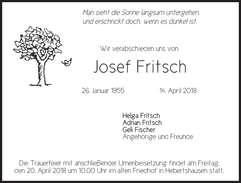 Hier finden Sie alle Traueranzeigen aus der Zeitung, die bisher für Josef Fritsch erschienen sind. Weitere Traueranzeigen, die in der Zeitung erscheinen, werden hier ebenfalls aufgelistet