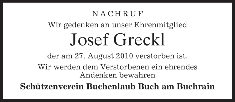 Hier finden Sie alle Traueranzeigen aus der Zeitung, die bisher für Josef Greckl erschienen sind. Weitere Traueranzeigen, die in der Zeitung erscheinen, werden hier ebenfalls aufgelistet