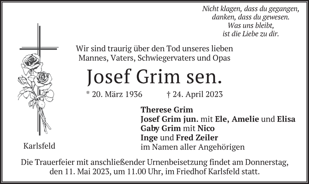 Hier finden Sie alle Traueranzeigen aus der Zeitung, die bisher für Josef Grim erschienen sind. Weitere Traueranzeigen, die in der Zeitung erscheinen, werden hier ebenfalls aufgelistet