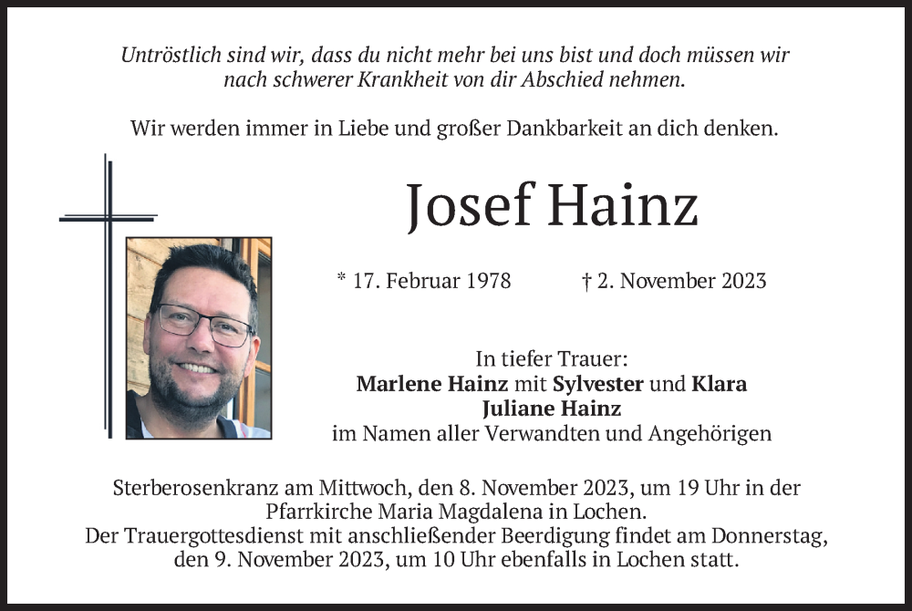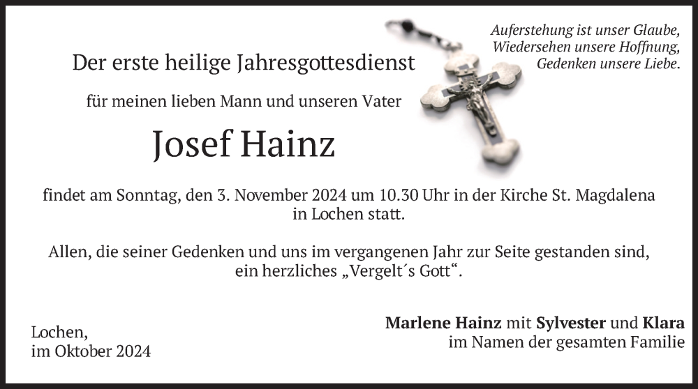 Hier finden Sie alle Traueranzeigen aus der Zeitung, die bisher für Josef Hainz erschienen sind. Weitere Traueranzeigen, die in der Zeitung erscheinen, werden hier ebenfalls aufgelistet