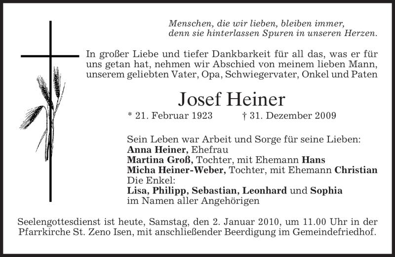 Hier finden Sie alle Traueranzeigen aus der Zeitung, die bisher für Josef Heiner erschienen sind. Weitere Traueranzeigen, die in der Zeitung erscheinen, werden hier ebenfalls aufgelistet