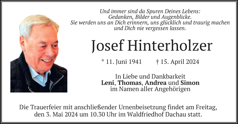 Hier finden Sie alle Traueranzeigen aus der Zeitung, die bisher für Josef Hinterholzer erschienen sind. Weitere Traueranzeigen, die in der Zeitung erscheinen, werden hier ebenfalls aufgelistet