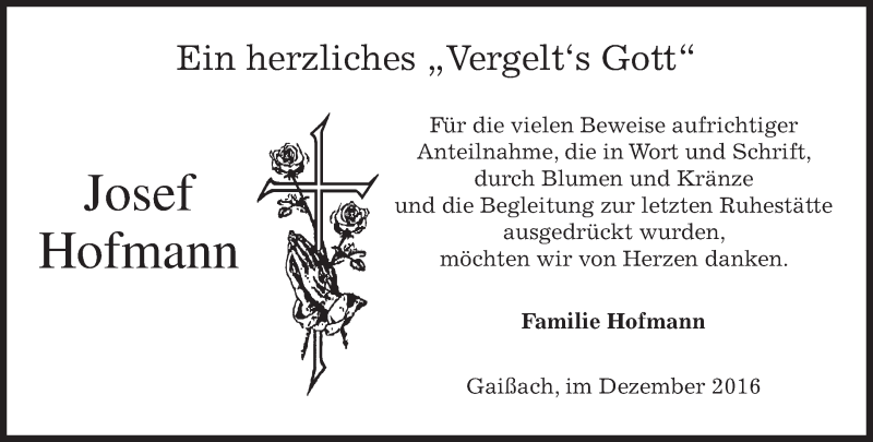 Hier finden Sie alle Traueranzeigen aus der Zeitung, die bisher für Josef Hofmann erschienen sind. Weitere Traueranzeigen, die in der Zeitung erscheinen, werden hier ebenfalls aufgelistet