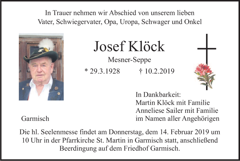 Hier finden Sie alle Traueranzeigen aus der Zeitung, die bisher für Josef Klöck erschienen sind. Weitere Traueranzeigen, die in der Zeitung erscheinen, werden hier ebenfalls aufgelistet