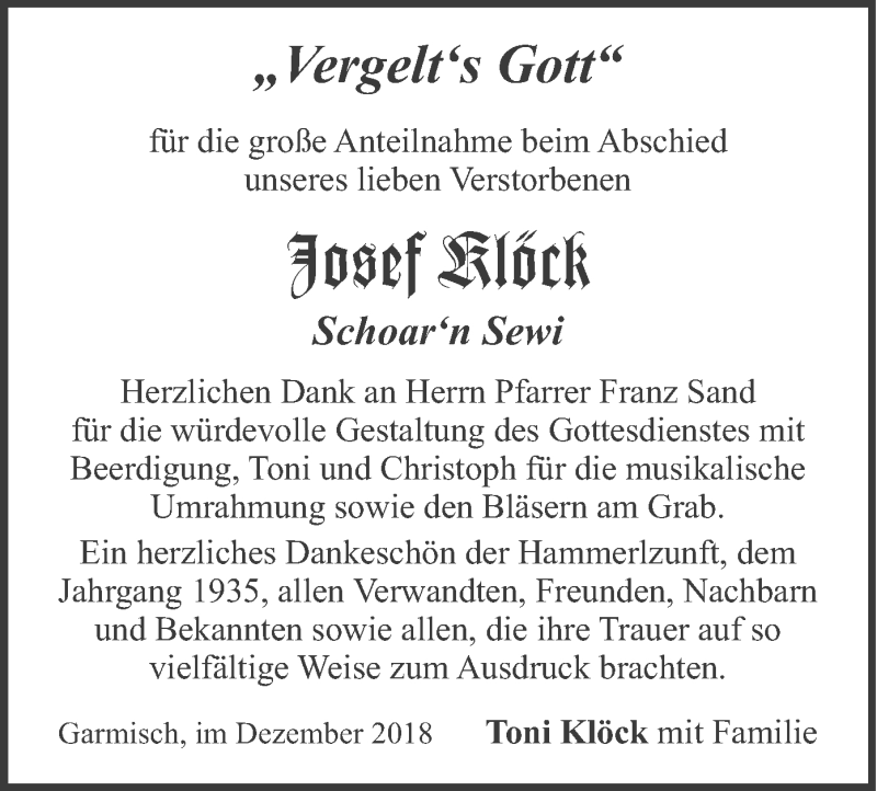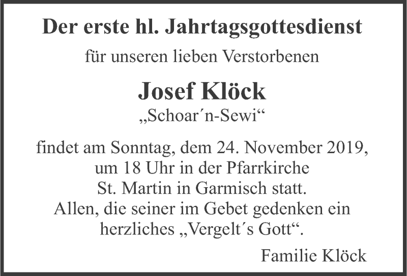 Hier finden Sie alle Traueranzeigen aus der Zeitung, die bisher für Josef Klöck erschienen sind. Weitere Traueranzeigen, die in der Zeitung erscheinen, werden hier ebenfalls aufgelistet