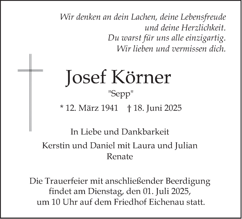 Hier finden Sie alle Traueranzeigen aus der Zeitung, die bisher für Josef Körner erschienen sind. Weitere Traueranzeigen, die in der Zeitung erscheinen, werden hier ebenfalls aufgelistet