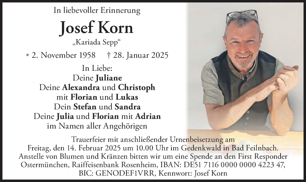 Hier finden Sie alle Traueranzeigen aus der Zeitung, die bisher für Josef Korn erschienen sind. Weitere Traueranzeigen, die in der Zeitung erscheinen, werden hier ebenfalls aufgelistet