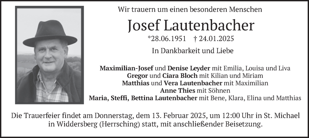 Hier finden Sie alle Traueranzeigen aus der Zeitung, die bisher für Josef Lautenbacher erschienen sind. Weitere Traueranzeigen, die in der Zeitung erscheinen, werden hier ebenfalls aufgelistet