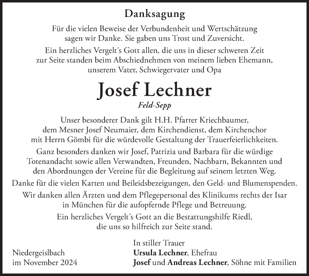 Hier finden Sie alle Traueranzeigen aus der Zeitung, die bisher für Josef Lechner erschienen sind. Weitere Traueranzeigen, die in der Zeitung erscheinen, werden hier ebenfalls aufgelistet