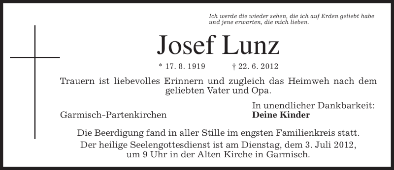 Hier finden Sie alle Traueranzeigen aus der Zeitung, die bisher für Josef Lunz erschienen sind. Weitere Traueranzeigen, die in der Zeitung erscheinen, werden hier ebenfalls aufgelistet