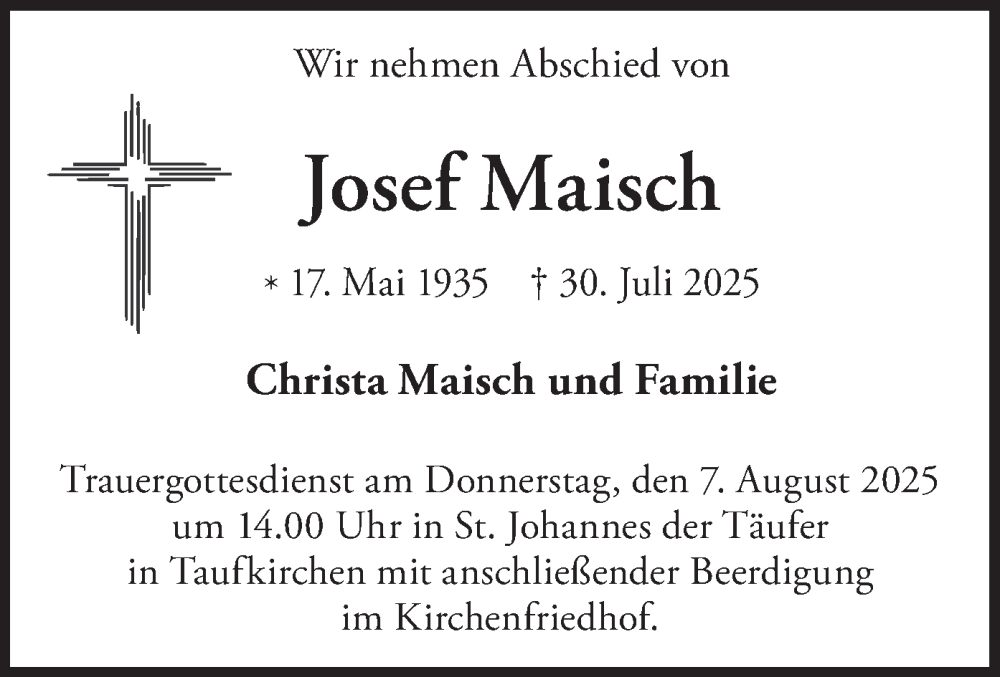 Hier finden Sie alle Traueranzeigen aus der Zeitung, die bisher für Josef Maisch erschienen sind. Weitere Traueranzeigen, die in der Zeitung erscheinen, werden hier ebenfalls aufgelistet