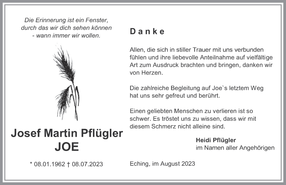 Hier finden Sie alle Traueranzeigen aus der Zeitung, die bisher für Josef Martin Pflügler erschienen sind. Weitere Traueranzeigen, die in der Zeitung erscheinen, werden hier ebenfalls aufgelistet