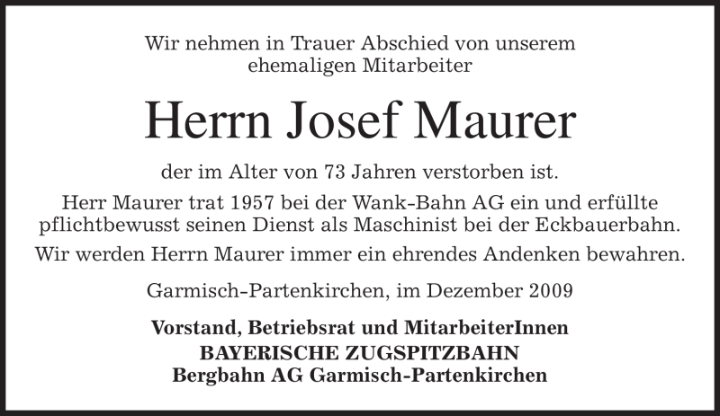 Hier finden Sie alle Traueranzeigen aus der Zeitung, die bisher für Josef Maurer erschienen sind. Weitere Traueranzeigen, die in der Zeitung erscheinen, werden hier ebenfalls aufgelistet