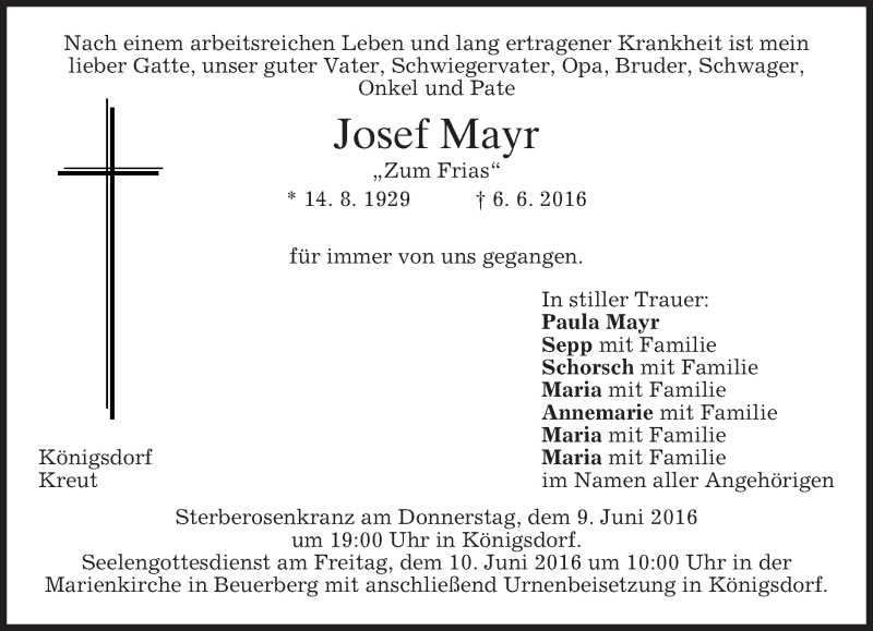 Hier finden Sie alle Traueranzeigen aus der Zeitung, die bisher für Josef Mayr erschienen sind. Weitere Traueranzeigen, die in der Zeitung erscheinen, werden hier ebenfalls aufgelistet