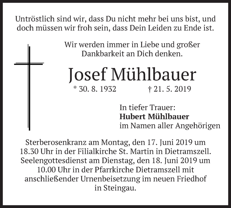 Hier finden Sie alle Traueranzeigen aus der Zeitung, die bisher für Josef Mühlbauer erschienen sind. Weitere Traueranzeigen, die in der Zeitung erscheinen, werden hier ebenfalls aufgelistet