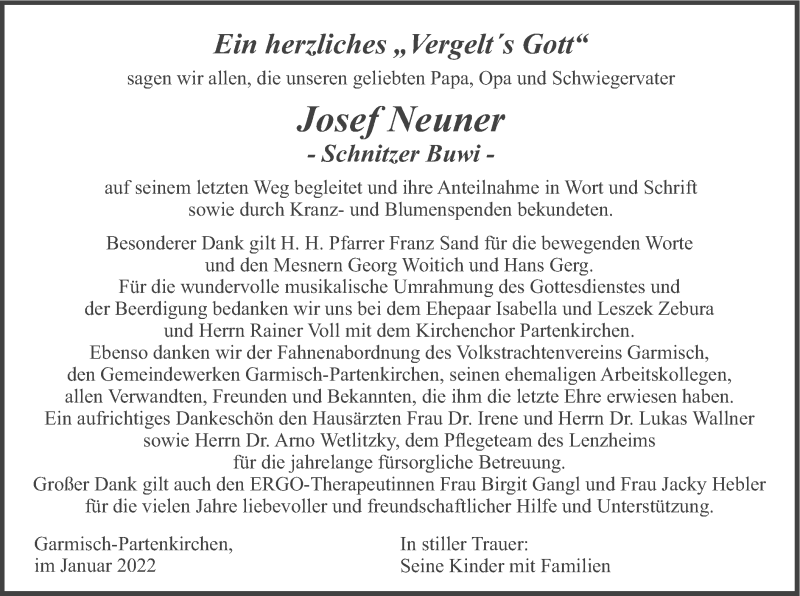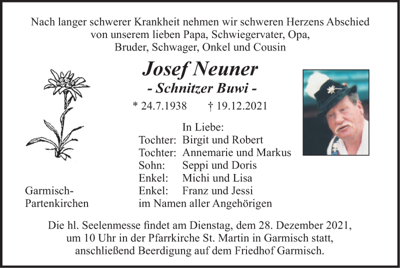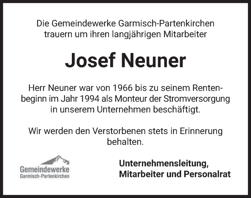 Hier finden Sie alle Traueranzeigen aus der Zeitung, die bisher für Josef Neuner erschienen sind. Weitere Traueranzeigen, die in der Zeitung erscheinen, werden hier ebenfalls aufgelistet