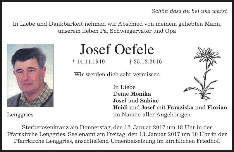 Hier finden Sie alle Traueranzeigen aus der Zeitung, die bisher für Josef Oefele erschienen sind. Weitere Traueranzeigen, die in der Zeitung erscheinen, werden hier ebenfalls aufgelistet