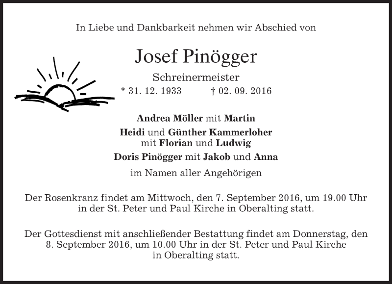 Hier finden Sie alle Traueranzeigen aus der Zeitung, die bisher für Josef Pinögger erschienen sind. Weitere Traueranzeigen, die in der Zeitung erscheinen, werden hier ebenfalls aufgelistet