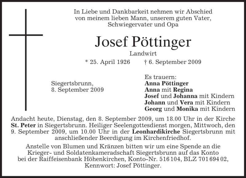 Hier finden Sie alle Traueranzeigen aus der Zeitung, die bisher für Josef Pöttinger erschienen sind. Weitere Traueranzeigen, die in der Zeitung erscheinen, werden hier ebenfalls aufgelistet