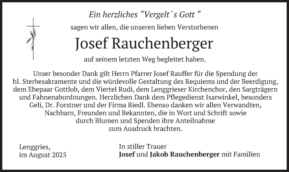 Hier finden Sie alle Traueranzeigen aus der Zeitung, die bisher für Josef Rauchenberger erschienen sind. Weitere Traueranzeigen, die in der Zeitung erscheinen, werden hier ebenfalls aufgelistet