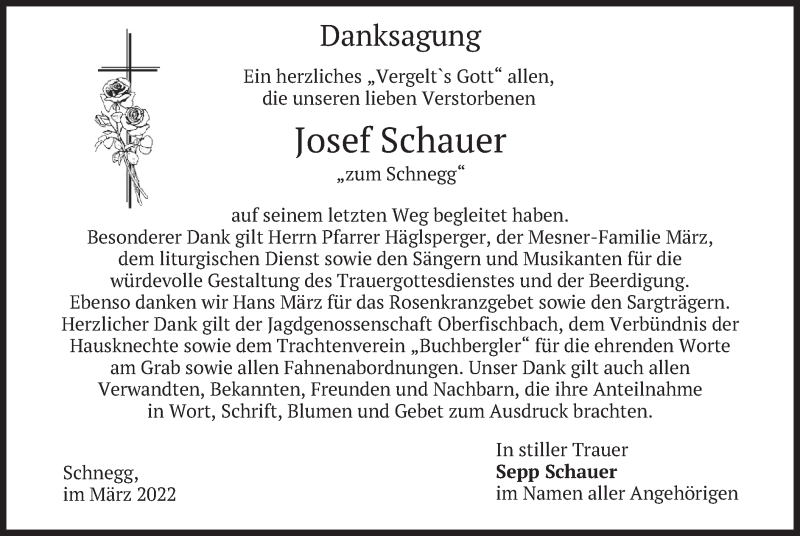 Hier finden Sie alle Traueranzeigen aus der Zeitung, die bisher für Josef Schauer erschienen sind. Weitere Traueranzeigen, die in der Zeitung erscheinen, werden hier ebenfalls aufgelistet