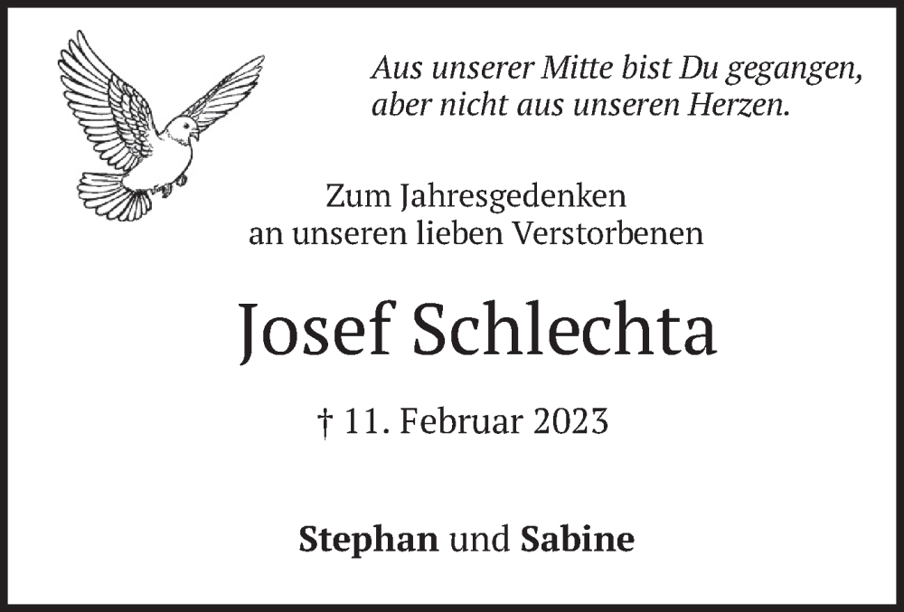 Hier finden Sie alle Traueranzeigen aus der Zeitung, die bisher für Josef Schlechta erschienen sind. Weitere Traueranzeigen, die in der Zeitung erscheinen, werden hier ebenfalls aufgelistet