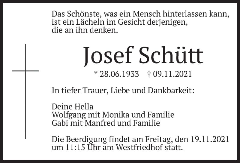 Hier finden Sie alle Traueranzeigen aus der Zeitung, die bisher für Josef Schütt erschienen sind. Weitere Traueranzeigen, die in der Zeitung erscheinen, werden hier ebenfalls aufgelistet