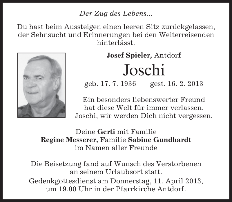 Hier finden Sie alle Traueranzeigen aus der Zeitung, die bisher für Josef Spieler erschienen sind. Weitere Traueranzeigen, die in der Zeitung erscheinen, werden hier ebenfalls aufgelistet