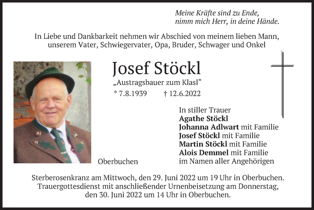 Hier finden Sie alle Traueranzeigen aus der Zeitung, die bisher für Josef Stöckl erschienen sind. Weitere Traueranzeigen, die in der Zeitung erscheinen, werden hier ebenfalls aufgelistet