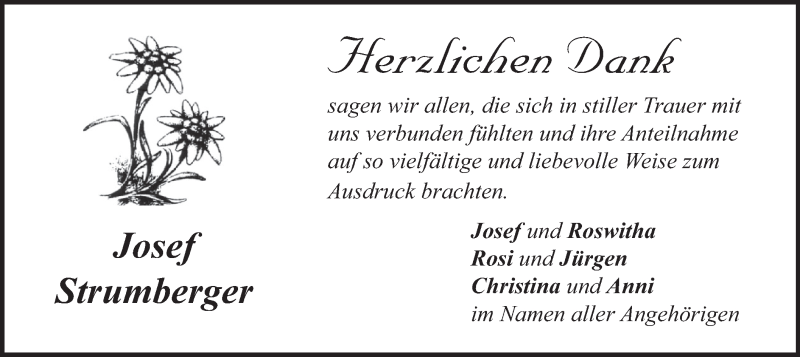 Hier finden Sie alle Traueranzeigen aus der Zeitung, die bisher für Josef Strumberger erschienen sind. Weitere Traueranzeigen, die in der Zeitung erscheinen, werden hier ebenfalls aufgelistet