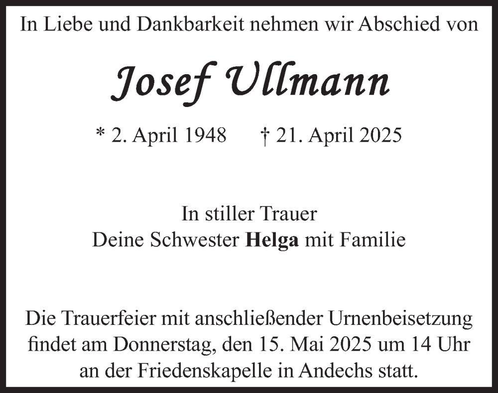 Hier finden Sie alle Traueranzeigen aus der Zeitung, die bisher für Josef Ullmann erschienen sind. Weitere Traueranzeigen, die in der Zeitung erscheinen, werden hier ebenfalls aufgelistet