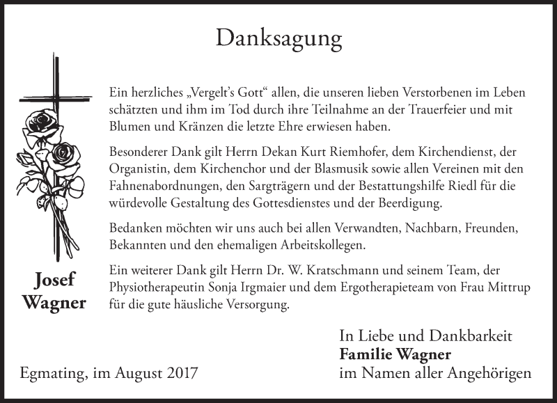 Hier finden Sie alle Traueranzeigen aus der Zeitung, die bisher für Josef Wagner erschienen sind. Weitere Traueranzeigen, die in der Zeitung erscheinen, werden hier ebenfalls aufgelistet