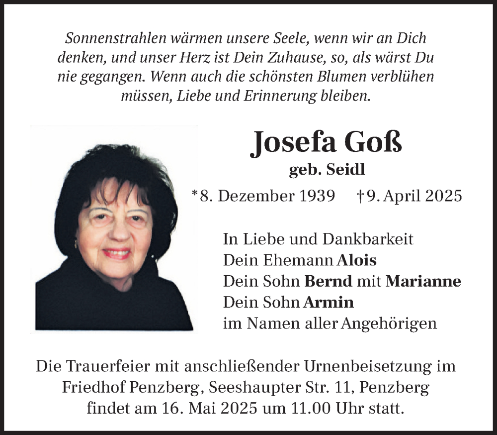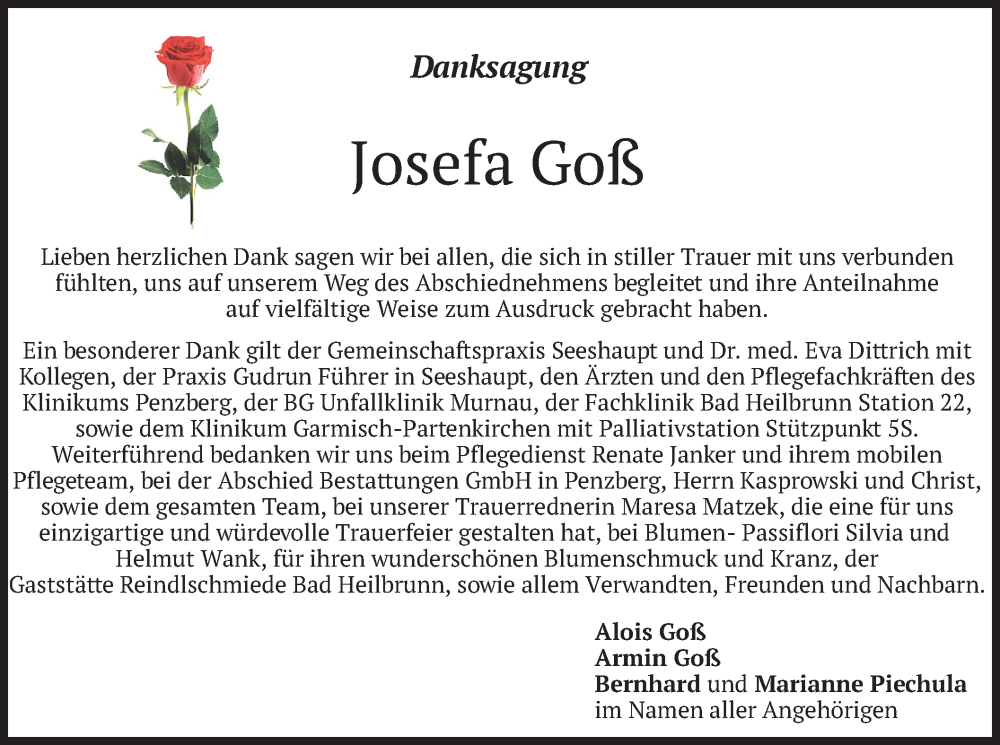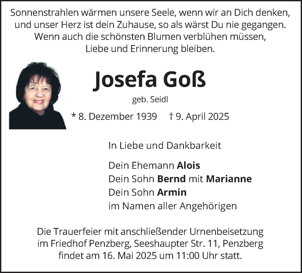 Hier finden Sie alle Traueranzeigen aus der Zeitung, die bisher für Josefa Goß erschienen sind. Weitere Traueranzeigen, die in der Zeitung erscheinen, werden hier ebenfalls aufgelistet