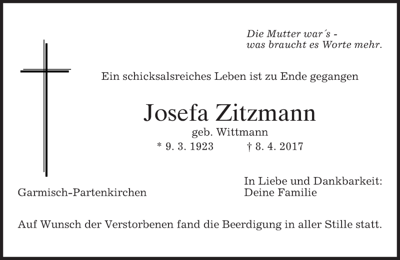 Hier finden Sie alle Traueranzeigen aus der Zeitung, die bisher für Josefa Zitzmann erschienen sind. Weitere Traueranzeigen, die in der Zeitung erscheinen, werden hier ebenfalls aufgelistet