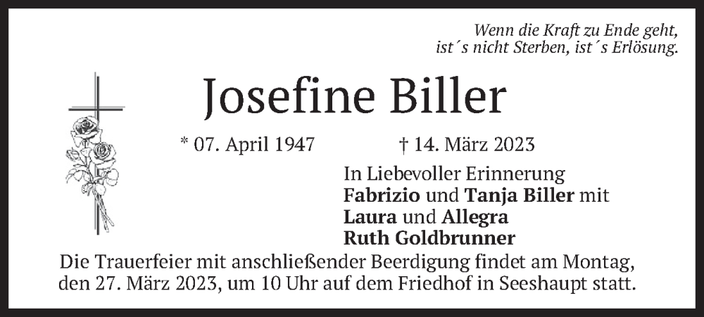 Hier finden Sie alle Traueranzeigen aus der Zeitung, die bisher für Josefine Biller erschienen sind. Weitere Traueranzeigen, die in der Zeitung erscheinen, werden hier ebenfalls aufgelistet