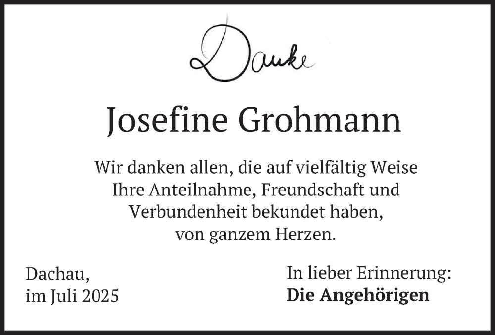 Hier finden Sie alle Traueranzeigen aus der Zeitung, die bisher für Josefine Grohmann erschienen sind. Weitere Traueranzeigen, die in der Zeitung erscheinen, werden hier ebenfalls aufgelistet