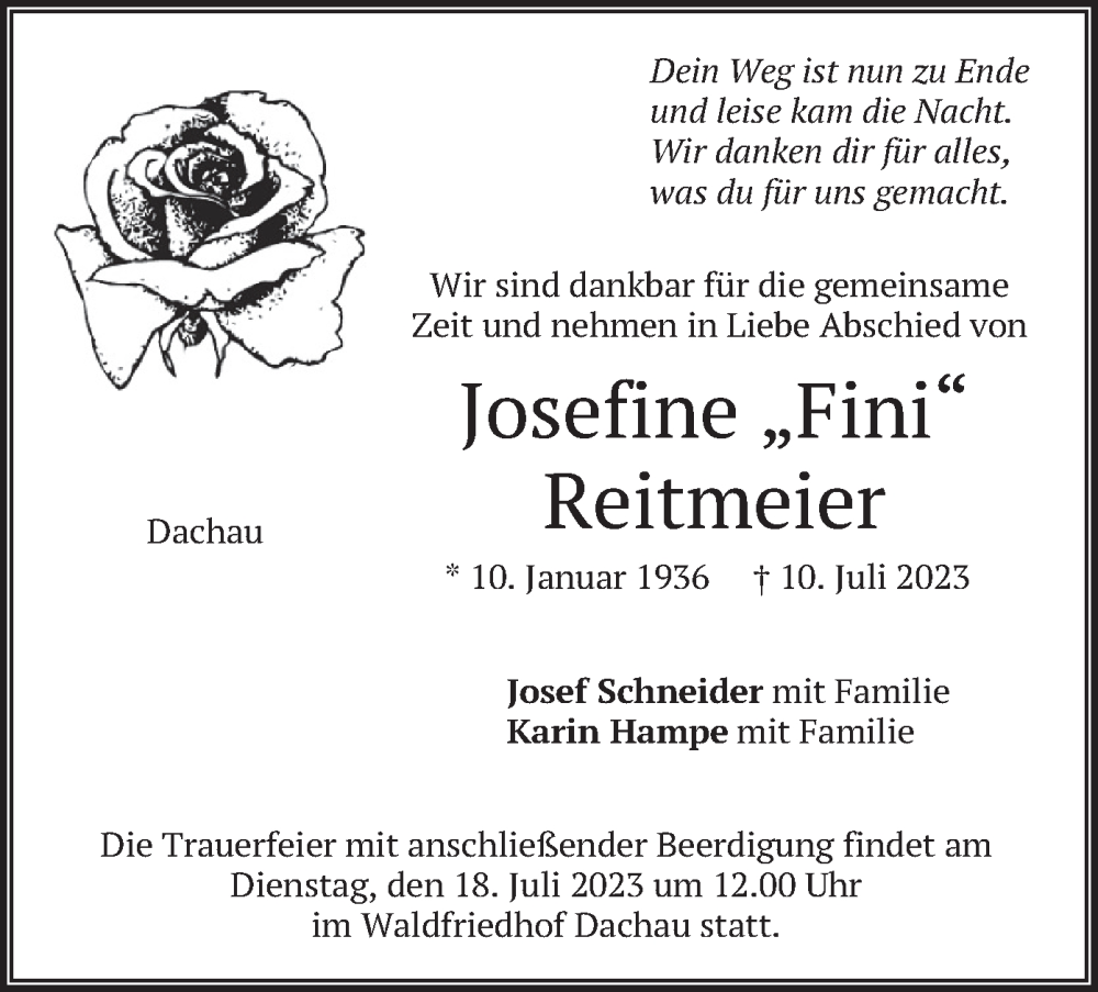 Hier finden Sie alle Traueranzeigen aus der Zeitung, die bisher für Josefine Reitmeier erschienen sind. Weitere Traueranzeigen, die in der Zeitung erscheinen, werden hier ebenfalls aufgelistet