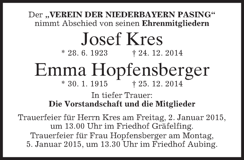 Hier finden Sie alle Traueranzeigen aus der Zeitung, die bisher für Josef Kres Emma Hopfensberger erschienen sind. Weitere Traueranzeigen, die in der Zeitung erscheinen, werden hier ebenfalls aufgelistet